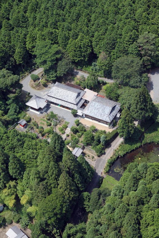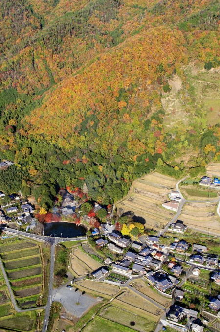 上空からは鎮守の森がうっそうとしているため、見ることができない。