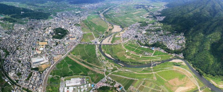 空から大堰川の大蛇行を捉える。亀岡盆地から園部町船岡を回り、日吉ダムへと180度方向を変える様は圧巻である。