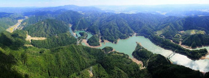 画面中央に世木ダムが見える。現役の発電用ダムで山を越えた新庄発電所に水を送っている。