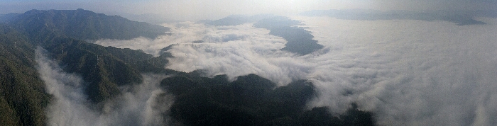 初秋から亀岡では雲海が発生する。よく見ると、川の流れのように、霧が保津峡から京都に向かって流れていく様子がわかる。亀岡盆地でたまっている重たい霧が生き物のようにのたうっている。