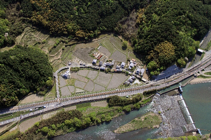 黄色く色が変わってきた麦畑と、田植えも近い水田ではそれぞれの水源から上流域より水が入って来ているのが分かる。川東の整然とした田の風情と、大井町の昔ながらの田の風情が対照的であり、特に千代川町湯井のあたりの緩やかな斜面で棚田は上空から見ると非常に美しい。