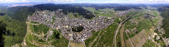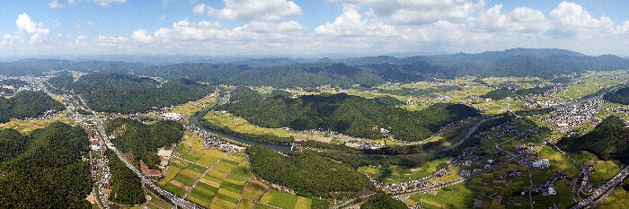 保津町上空から東側の亀岡市街地約220度の22枚のデータ合成パノラマ写真である。