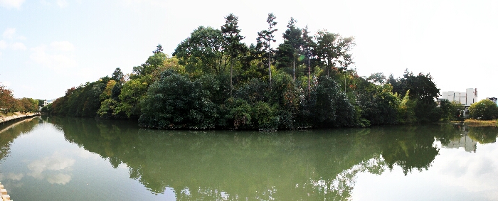 山陰街道が通り、城下町が広がる亀山城の南側は、内堀、外堀、惣堀の三重の堀と御土居がめぐり、堅牢な構えを呈しています。一方、南郷公園の立地する北側の搦手は、外堀が一重にめぐらされているだけとなっています。これは、有事の際には、保津川の流れを塞き止めると、北側の水田は二気に大きな堀となるように考案されているためです。