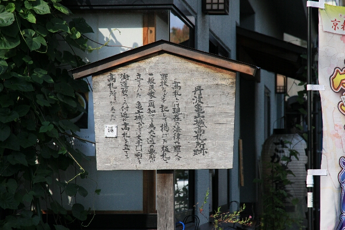 高札とは現代の法律や罪人の罪状などを記して掲げた板札で一般民家へ周知する為交通の要所に立てられた。亀山城下では大手門へ向かう街道筋のこの付近に高札を立てる高札所があった。(解説板より) 亀岡市本町