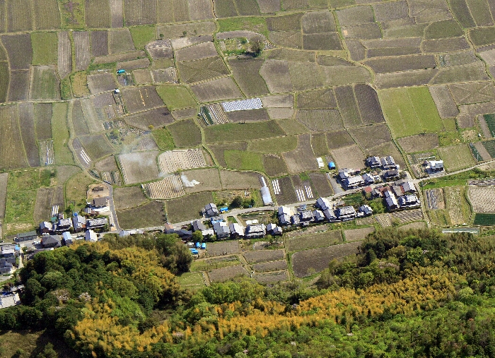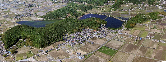 この付近の田の形は上空から見ると非常に複雑で、地下に眠る遺跡をトレースした模様ではないかと想像力をかき立てる。