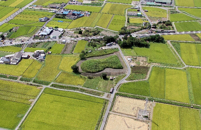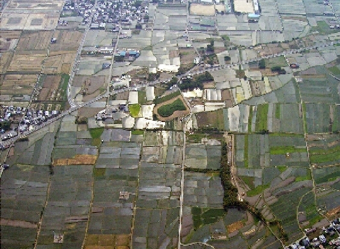 周辺の田畑が圃場整備で区画整理された関係で、昔の田畑の区画との対比が面白い。