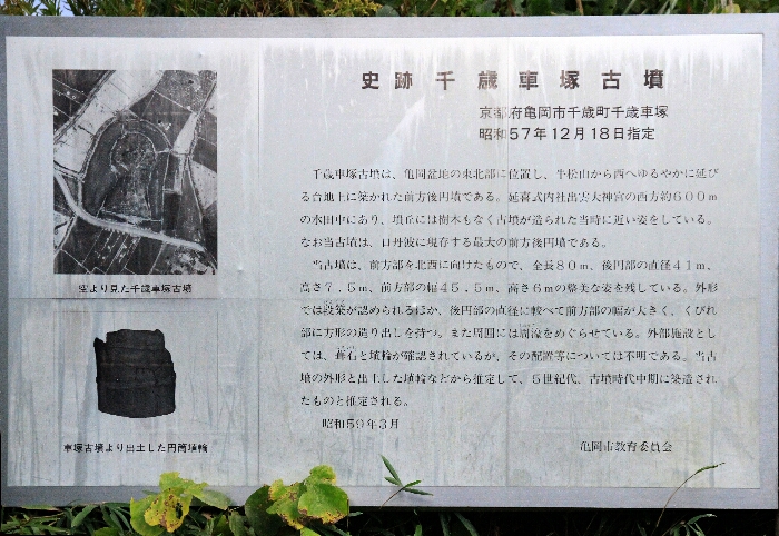 千歳車塚古墳は亀岡盆地の東北部に位置し牛松山から西へゆるやかに延びる台地上に築かれた前方後円墳である。延喜式内杜出雲大神宮の西方役600mの水田中にあり、墳丘には樹木もなく古墳が造られた当時に近い姿をしている。なお当古墳は、口丹波に現存する最大の前方後円墳である。