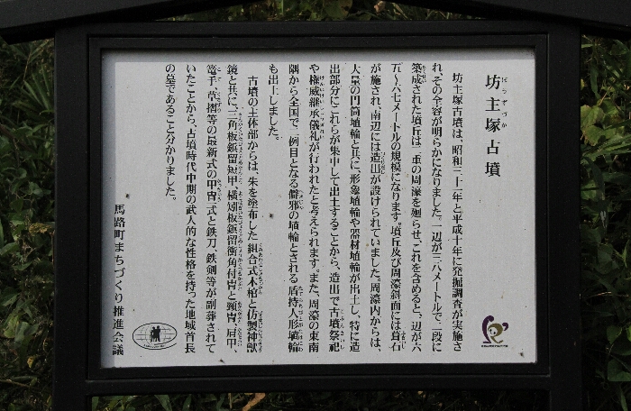 特に造出しには、円筒埴輪とともに馬・鳥・人物・笠(蓋)の埴輪が、さらに周温と周濠の間の堤にも馬・盾、盾持ち人形埴輪が立てられている。また、棺の中には鏡とともに甲冑一式が入れてあったことから、甲冑を身につけ、手に刀を待った馬路の王の姿が目に浮かぶ。 古墳は「倭の五王の時代」である五世紀後半に築かれ、倭政権の一翼を担った武人的な王の姿が想像される。これが発掘調査によって明らかになった坊主塚古墳の姿であり、今の姿から想像することは難しい。(我がまち馬路より)