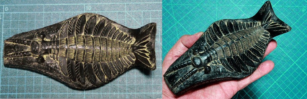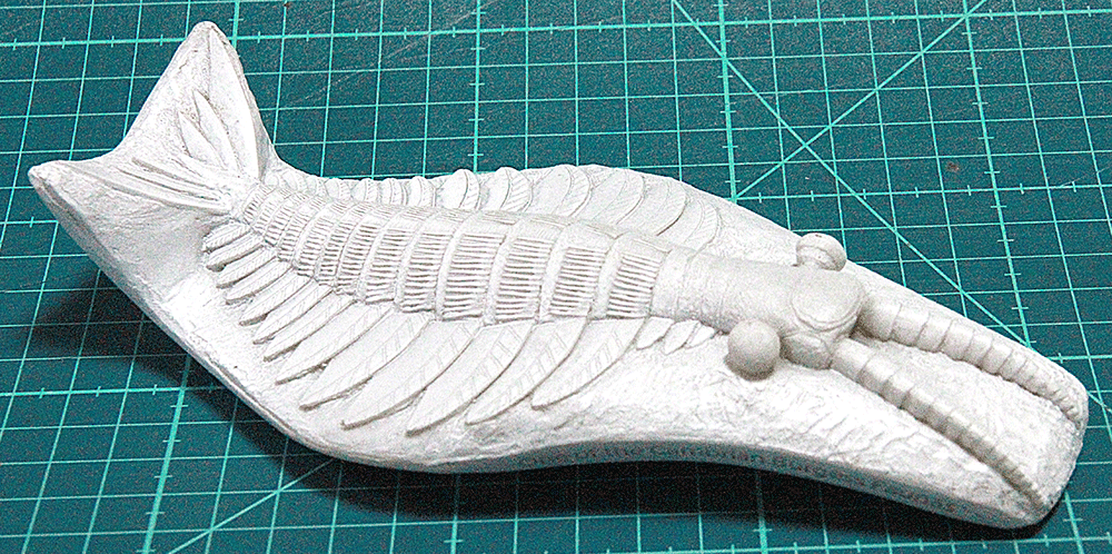 ちまたにはいろいろと模型は出ていますが、今回は最近の復元資料を元にした、「発掘風アノマロカリスペーパーウエイト」を製作しました。頭部のこぶのような造形や、首元の小さな3対のひれ、遊泳用のひれの模様、背中のえら等も再現してみました。