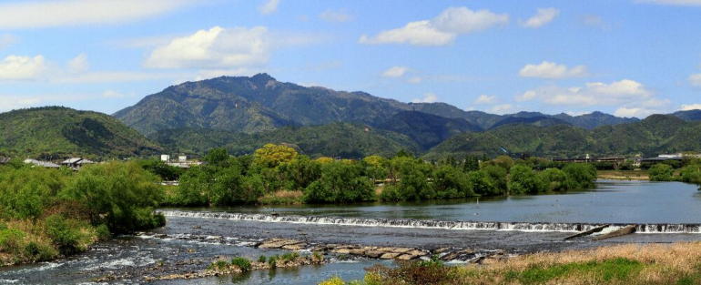 季節ごと、お天気の具合で様々な表情を見せる愛宕山、五月の新緑萌える時期の景色である。ちなみに大災害を引き起こした3年前の台風以前の様子であり、現在は河川敷の樹木は撤去されている。