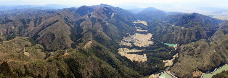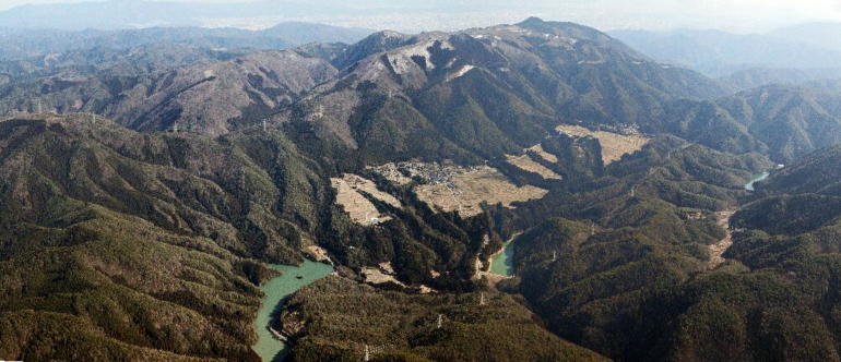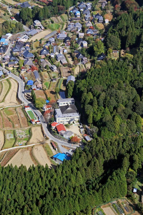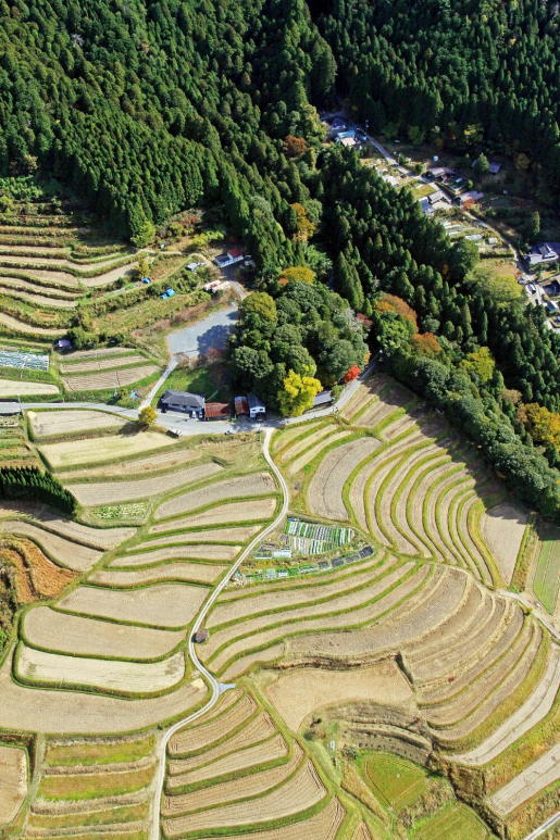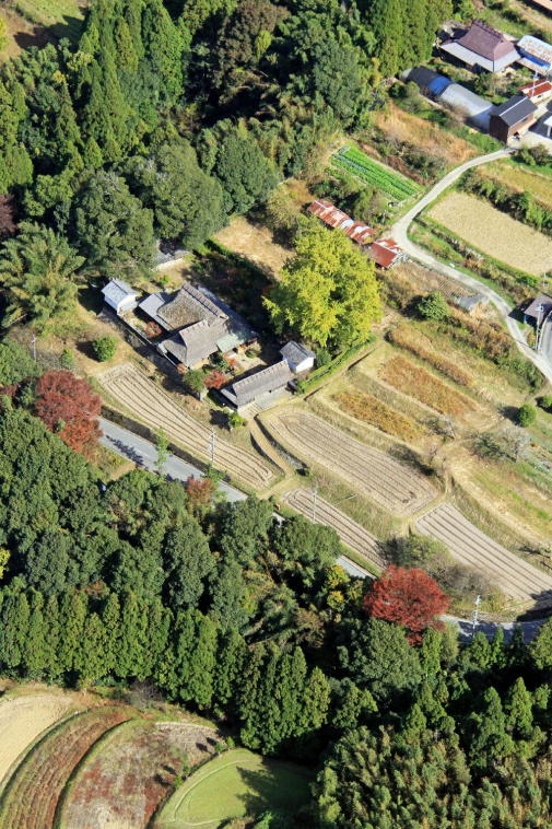 空から見ると細長い谷にも田畑がある。