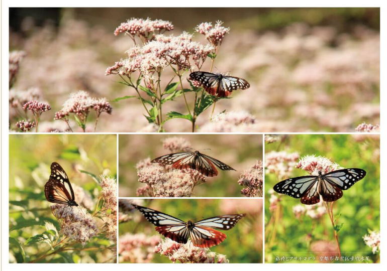 一番上の写真の蝶には羽に文字が書かれている。これはアサギマダラの渡りを調査するための標識で、ネット上で移動情報が交換されている。