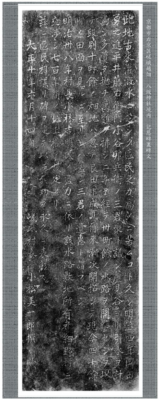 越畑の宕陰小中学校の山手にある、八坂神社境内に設置されている、記念碑の裏の碑文の拓本である。