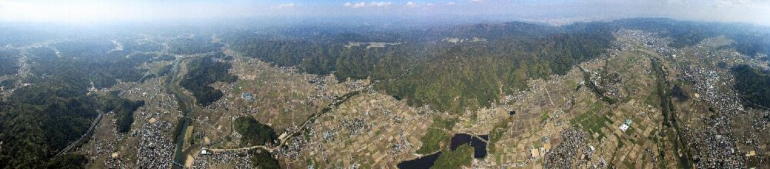 亀岡市馬路町上空から遠く愛宕山麓宕陰を臨む。