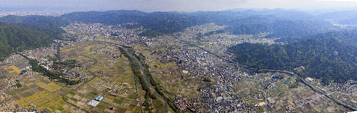 保津町上空から東側の亀岡市街地約220度の22枚のデータ合成パノラマ写真である。